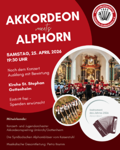 Am Freitag, den 27.03.2026 findet im Proberaum des Akkordeonspielrings Umkirch/Gottenheim e.V. (Vereinsheim, Schulstr. 17, 79288 Gottenheim) um 20 Uhr die Generalversammlung für das Vereinsjahr 2025 statt. Hierzu sind alle Mitglieder, Freunde und Gönner des Vereins recht herzlich eingeladen! Tagesordnung: 1. Begrüßung durch den 1. Vorsitzenden 2. Tätigkeitsbericht 2025 3. Bericht der Jugendleiterin 4. Bericht der …